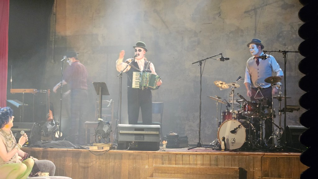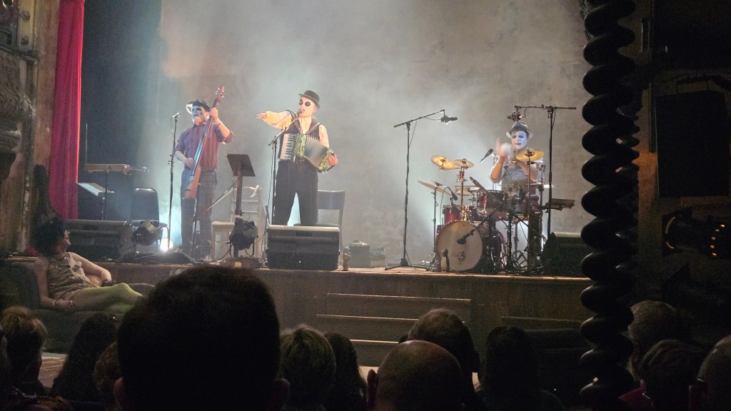 As always the band were immaculately dressed suits, hats and grease-painted circus faces. Adrian and Budi had similar makeup accentuating their lines to almost Halloween skeletal appearance while Martyn had panda like face paint.  He wore a FCK PTN sticker (wonder what side he’s on 😊) on his bowler hat and cut and an imposing figure.  Occasional glimpses of his long pony tail flowing down his back during the quicker moments of accordion mayhem.