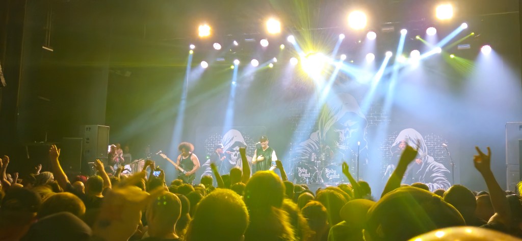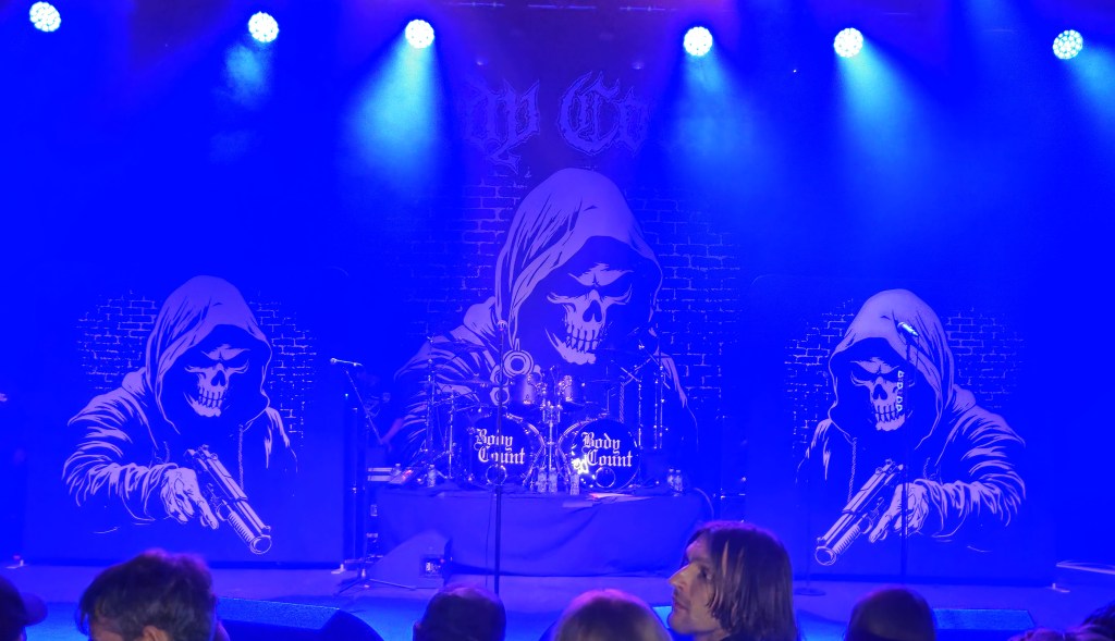 The ‘skull n gun hoody’ black stage set back drops pretty much explain all you need to know about Body Count and rap superstar Ice-T – thank fuck he went metal!! Body Count still matters!