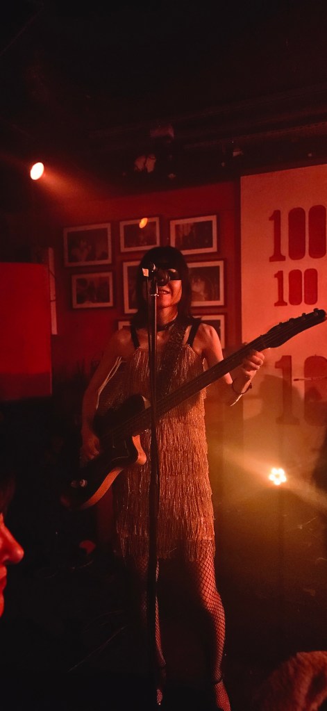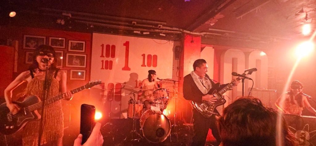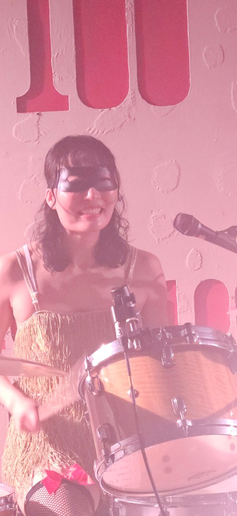 Style wise all the girls are wearing fishnets, 30’s style flapper dresses and masquerade style eye masks, whilst Nao is tuxedo-clad white shirt with a bolo tie. Basically they look just like they do on their LP covers and promo material. It’s a late start 10:30 and approx. a 75 min set that’s fast, frenetic, wild and totally bonkers. The girls go through the entire set smiling with infectious enthusiasm as if their lives depended on it – they were clearly having a bloody good time. The beat is roughly the same throughout and a sold out 100 club audience – many dressed in 50s psychobilly gear and tattoos loved it. Keyboardist Miku often used her feet, arms and hands to play the keyboard and the Theremin (that’s now the third band I know that use one after John Otway and The Tiger Lillies) creating ufo style ‘outer-space sounds’. I think I just witnessed magic happening. Saori grinning ear to ear beats the crap out of the drums and bassist Rie (looking well cool) is solid on bass and harmonies. They are not the best musicians in the world but that misses the point – together they make a glorious sound and look ace! Nao is a decent enough front man, got the looks and the moves and plays some slick licks and solos on the guitar.