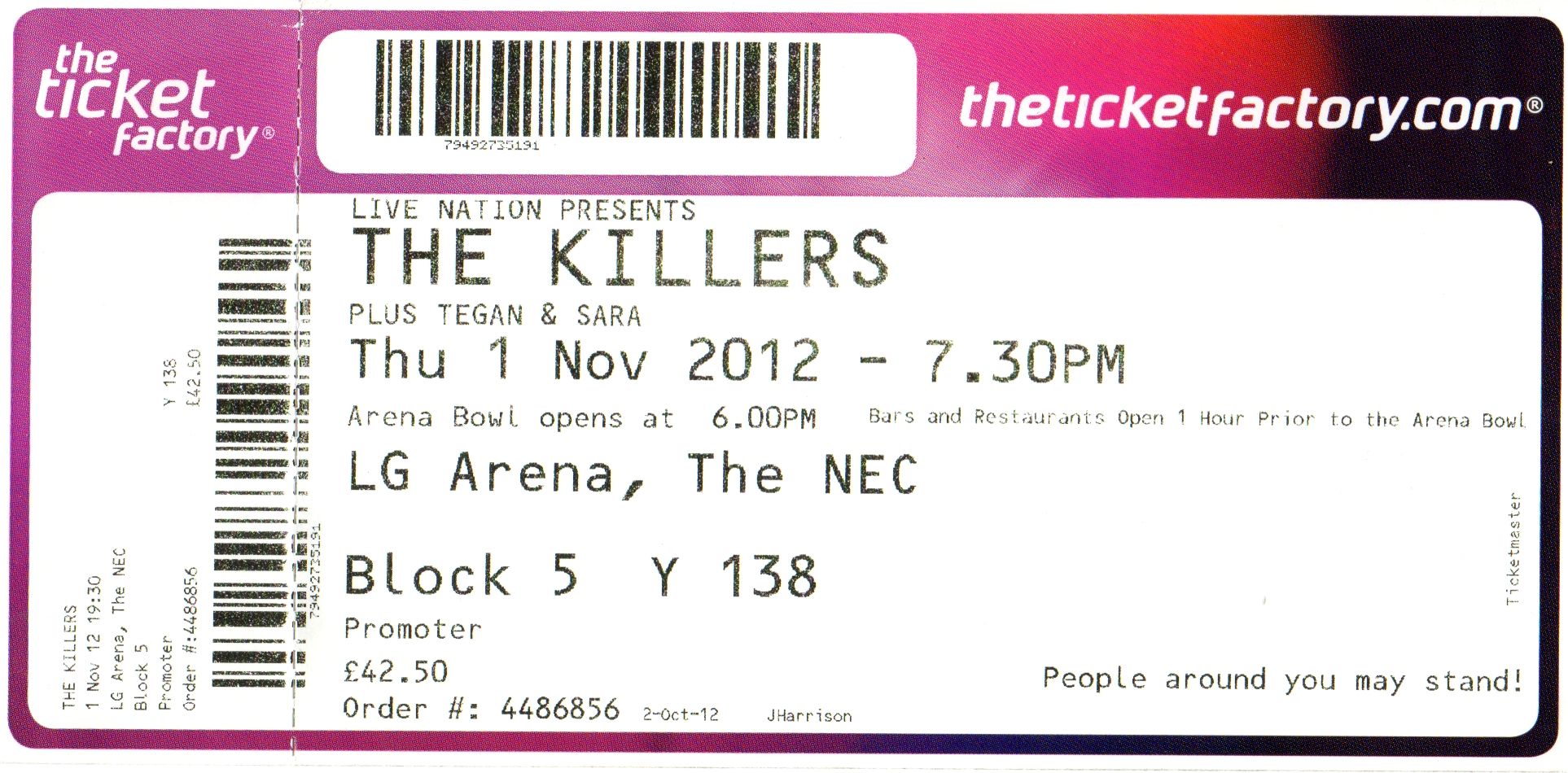 Stub – The Killers [1 Nov 2012] Birmingham NEC